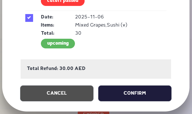 how can I cancel a subscription meal? If your child will be absent and you’d like to cancel a meal from their active subscription, please follow these steps: ⚠️ Cancellations are only available before the daily cut-off time. ⚠️ Meals for the same day cannot be cancelled once preparation has started. Step 1: Access the Smart Canteen Portal Visit our platform through the following link:👉 dashboard.smartcanteen.aeor download our Mobile App here. Step 2: Select your child from the list Step 3: Click “Manage Subscriptions.” Step 4: Find and click cancel on the required subscription from the list. Step 5: The subscription days will appear on the screen. If the selected day(s) are eligible and have not passed the cut-off time, a check button will be available.Select one or multiple eligible days by checking the boxes next to them, then click Confirm.The refund amount will be automatically calculated based on the cancelled days.The amount will be refunded automatically to the same bank card used for the original subscription payment.Please allow 3 to 10 business days for the refund to appear on your card statement.